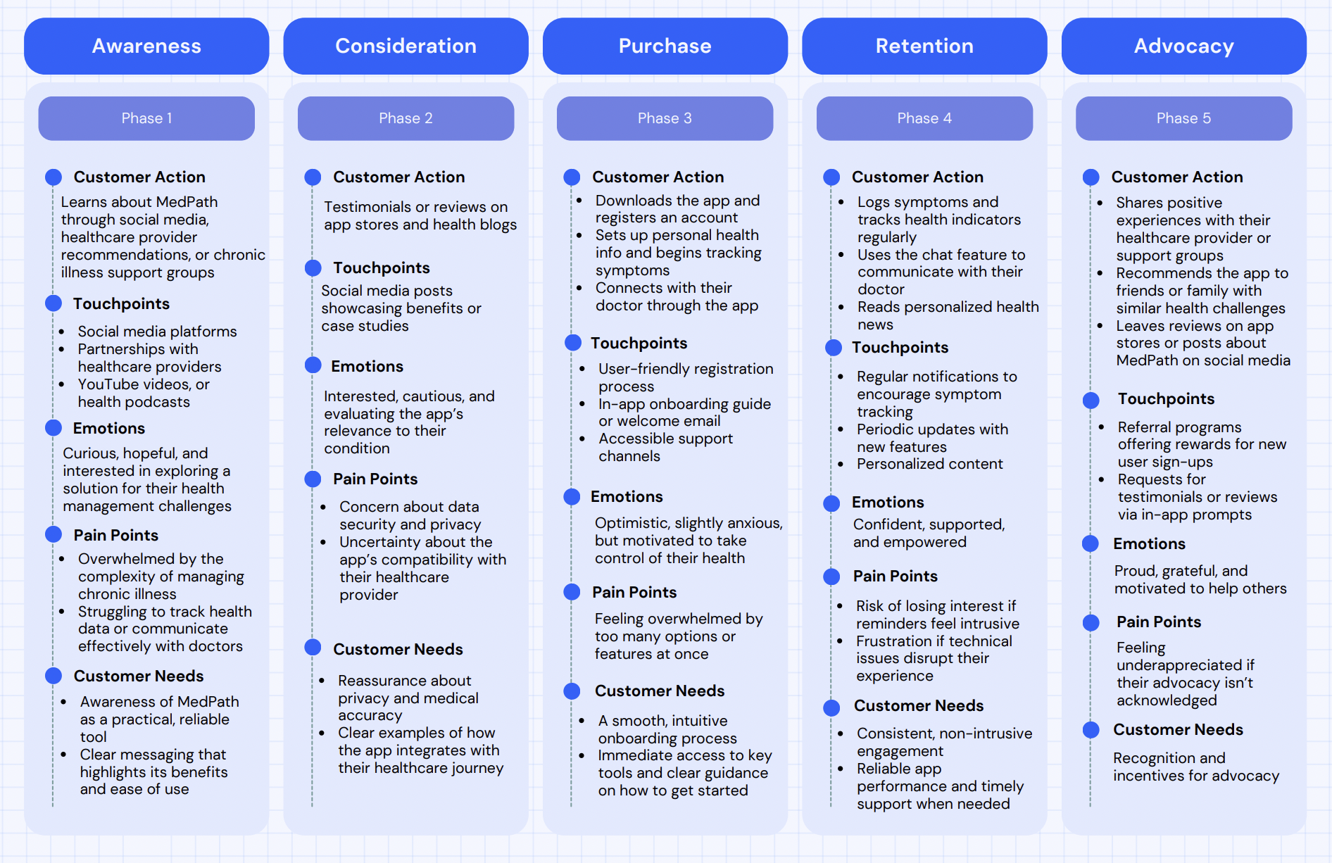 The customer journey for MedPath captures the experience of patients feeling truly accompanied in managing their chronic illness. From the moment they discover the app, they begin to feel supported and understood, with tools designed to ease the challenges of daily health management. Each stage of the journey reinforces their confidence and trust, making them feel empowered and cared for. MedPath is a companion that helps patients navigate their health journey with guidance, connection, and personalized support.